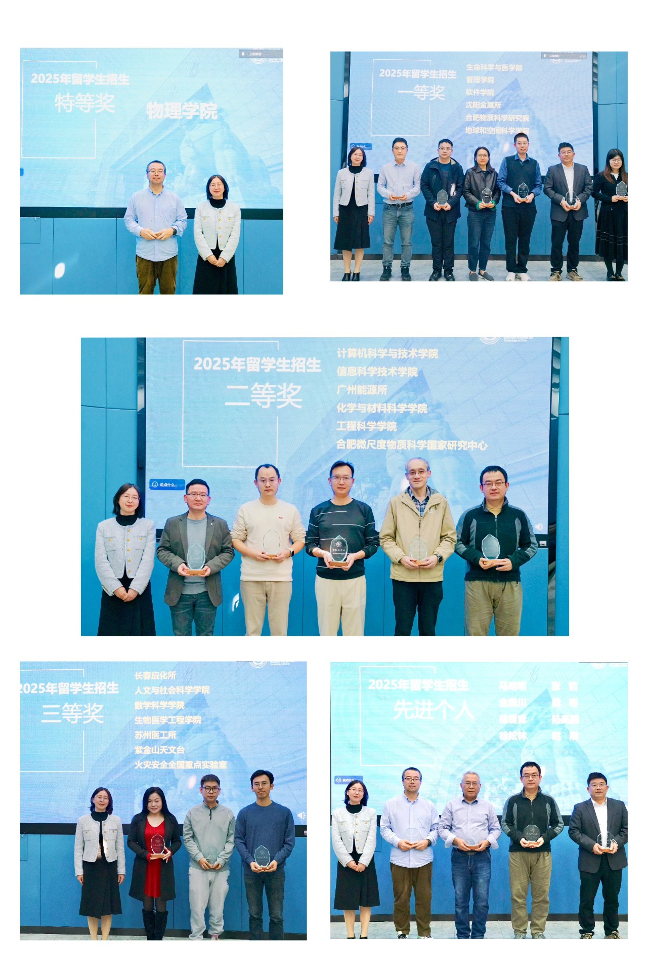 之后会议对2025年留学生招生团队进行了表彰,以鼓励各招生培养单位进一步创新招生宣传手段、优化生源结构、提升生源质量,推动我校留学生招生工作再上新台阶。物理学院荣获团队特等奖。荣获团队一等奖的单位有生命科学与医学部、管理学院、软件学院、中国科学院金属研究所、合肥物质科学研究院、地球和空间科学学院。荣获团队二等奖的单位有计算机科学与技术学院、信息科学技术学院、中国科学院广州能源所、化学与材料科学学院、工程科学学院、合肥微尺度物质科学国家研究中心。荣获团队三等奖的单位有中国科学院长春应用化学研究所、人文与社会科学学院、数学科学学院、生物医学工程学院、中国科学院苏州生物医学工程技术研究所、中国科学院紫金山天文台、火灾安全全国重点实验室。会议还对在2025年留学生招生工作中做出突出贡献的先进个人进行了表彰。